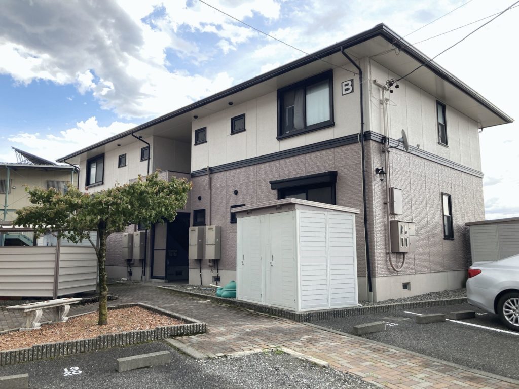ナイスロード北側に建つ南向きのアパートです。大型店が近くに多数あり、とても便利な場所です。